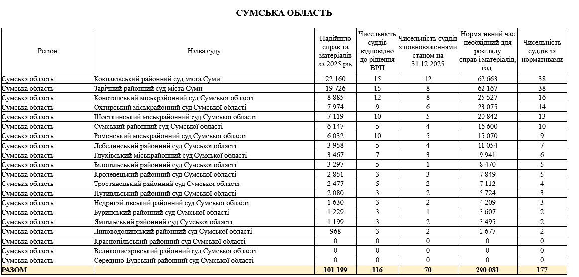 Рада суддів України оновила інтерактивну карту судів України з розрахунками нормативів навантаження на суддів і суди з урахуванням кількості справ, які розглядалися судами впродовж 2025 року.